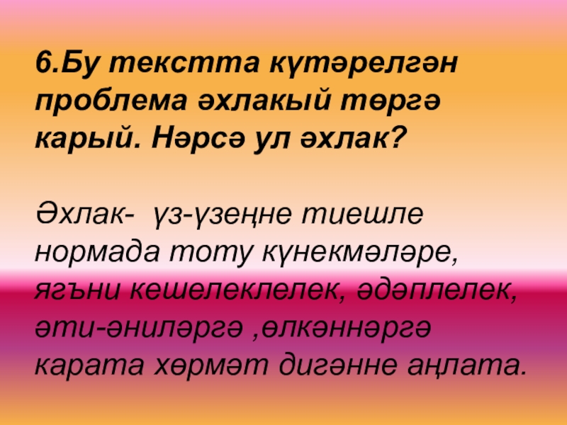 Слайд 296.Бу текстта күтәрелгән проблема әхлакый төргә карый. Нәрсә ул әхлак?