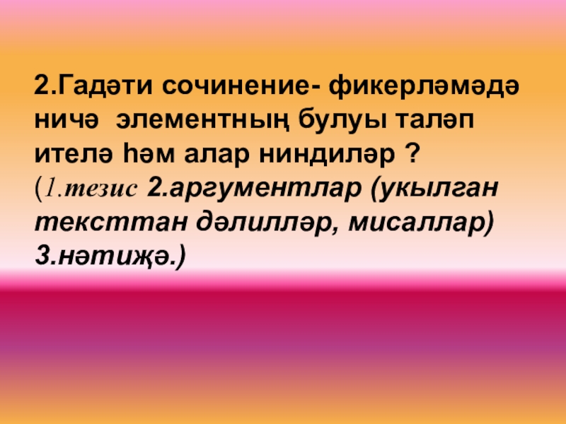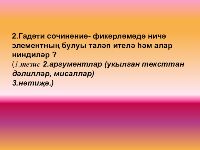 Слайд 192.Гадәти сочинение- фикерләмәдә ничә элементның булуы таләп ителә һәм алар ниндиләр