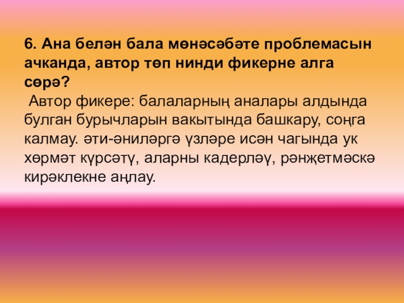Слайд 366. Ана белән бала мөнәсәбәте проблемасын ачканда, автор төп нинди фикерне