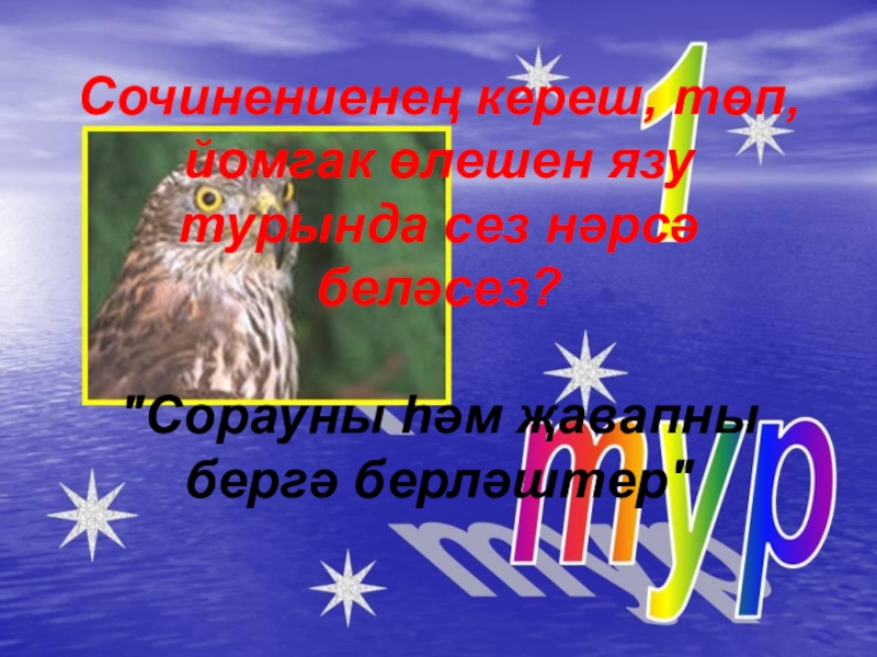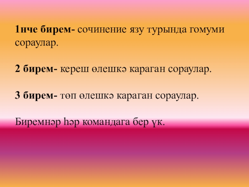 Слайд 171нче бирем- сочинение язу турында гомуми сораулар.