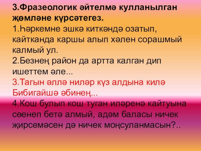 Слайд 703.Фразеологик әйтелмә кулланылган җөмләне күрсәтегез.