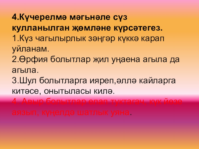 Слайд 714.Күчерелмә мәгьнәле сүз кулланылган җөмләне күрсәтегез.