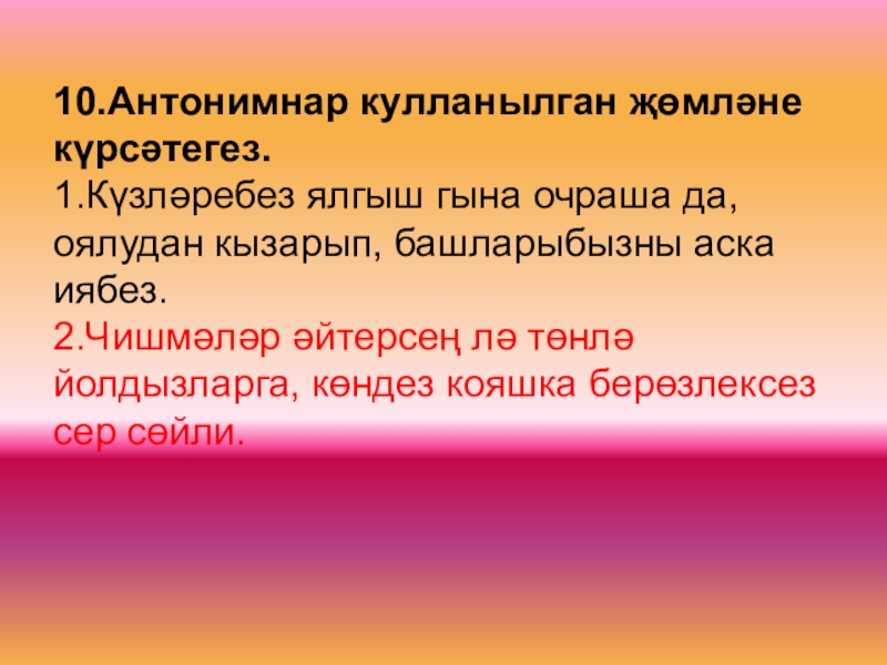 Слайд 7710.Антонимнар кулланылган җөмләне күрсәтегез.
