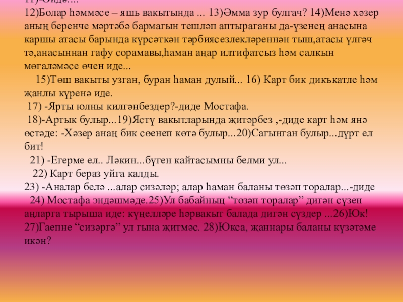 15)Төш вакыты узган, буран һаман дулый... 16) Карт бик дикъкатле һәм җанлы күренә иде.