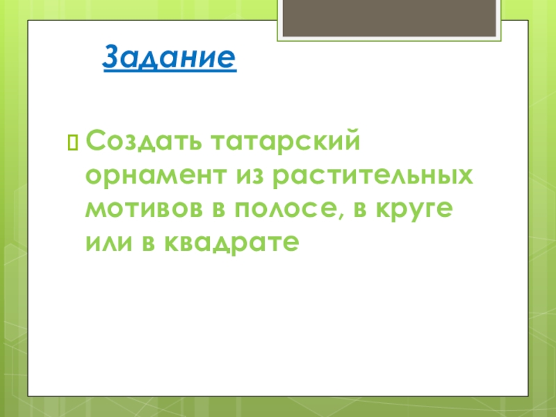 Задание Создать татарский орнамент из растительных мотивов в полосе, в круге или в квадрате