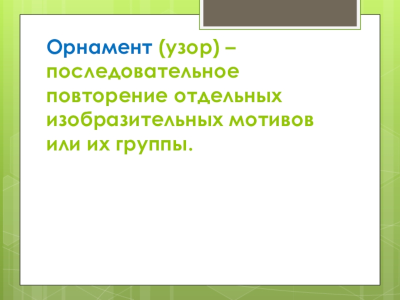 Слайд 2Орнамент (узор) – последовательное повторение отдельных изобразительных мотивов или их группы.