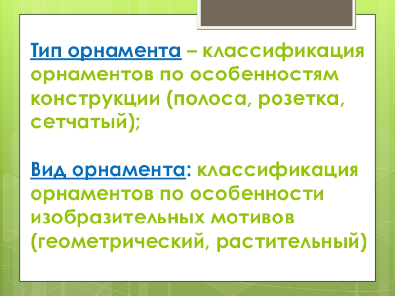 Тип орнамента – классификация  орнаментов по особенностям конструкции (полоса, розетка, сетчатый);  Вид орнамента: классификация орнаментов по особенности