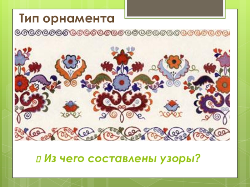 Слайд 3Тип орнамента – классификация  орнаментов по особенностям конструкции (полоса, розетка, сетчатый); Вид орнамента: