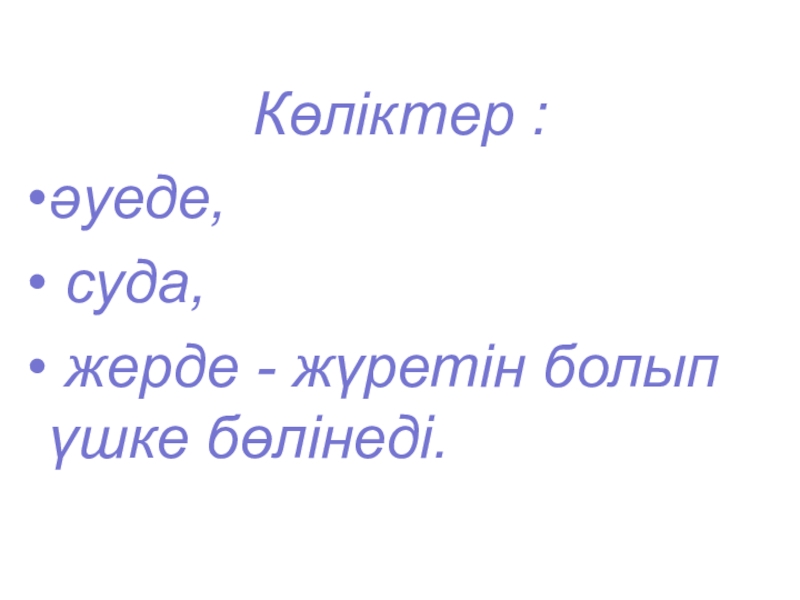 Көліктер : әуеде, суда, жерде - жүретін болып үшке бөлінеді.