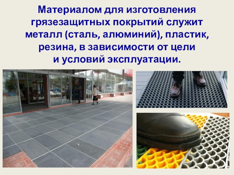Слайд 16 Материалом для изготовления грязезащитных покрытий служит металл (сталь, алюминий), пластик, резина,