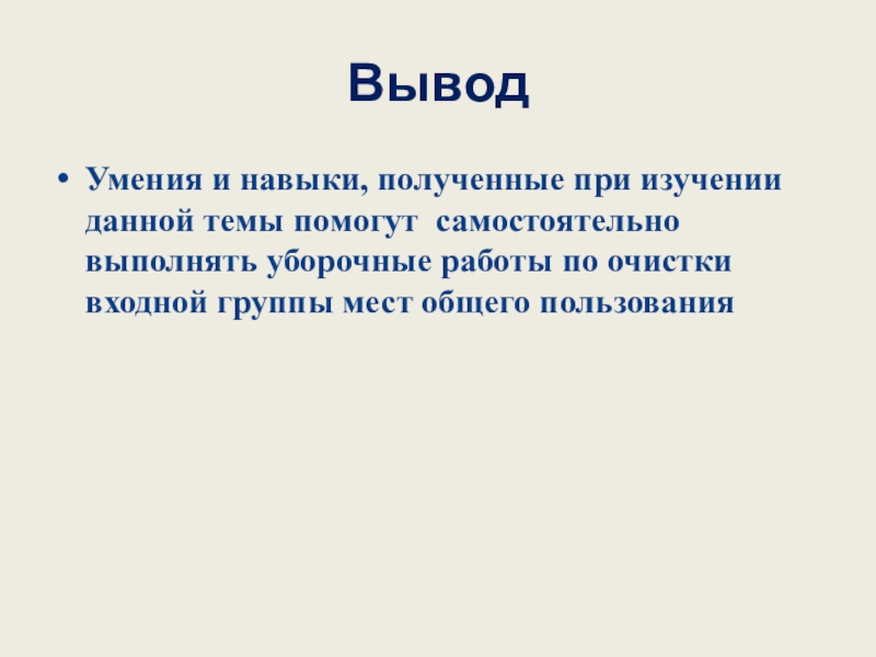 ВыводУмения и навыки, полученные при изучении данной темы помогут самостоятельно выполнять уборочные работы по очистки входной группы