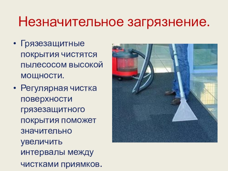 Незначительное загрязнение.Грязезащитные покрытия чистятся пылесосом высокой мощности.Регулярная чистка поверхности грязезащитного покрытия поможет значительно увеличить интервалы между чистками