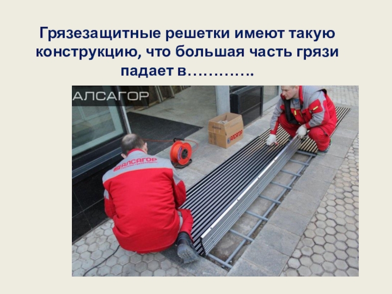 Слайд 30Грязезащитные решетки имеют такую конструкцию, что большая часть грязи падает в………….
