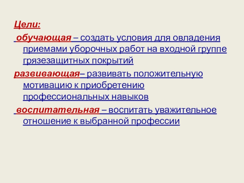 Цели: обучающая – создать условия для овладения приемами уборочных работ на входной группе грязезащитных покрытий развивающая– развивать положительную мотивацию к приобретению профессиональных навыков воспитательная – воспитать уважительное отношение к выбранной профессии