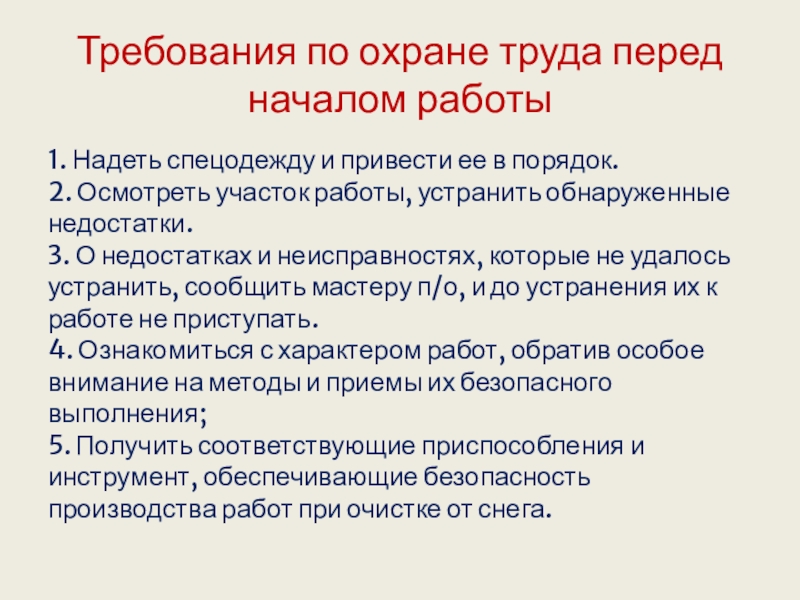 ее в порядок. 2. Осмотреть участок работы, устранить обнаруженные недостатки.  3. О недостатках и неисправностях, которые не удалось устранить, сообщить мастеру п/о, и до устранения их к работе не приступать.  4. Ознакомиться с характером работ, обратив особое внимание на методы и приемы их безопасного выполнения;  5. Получить соответствующие приспособления и инструмент, обеспечивающие безопасность производства работ при очистке от снега.