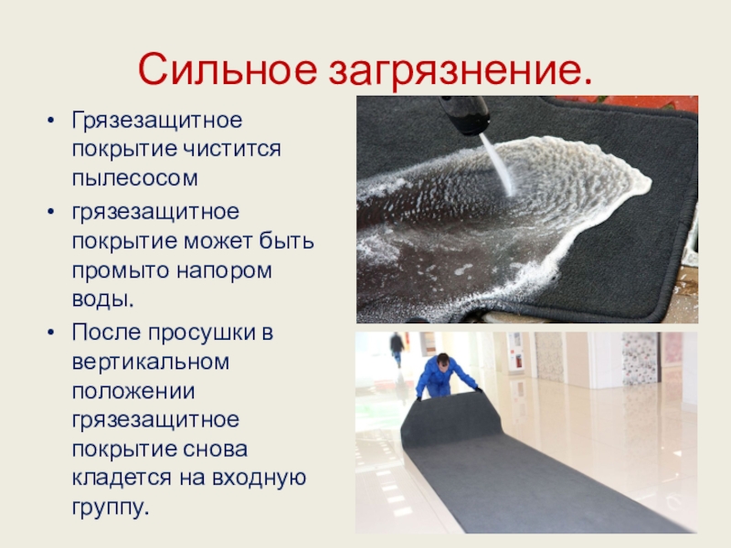 Сильное загрязнение.Грязезащитное покрытие чистится пылесосомгрязезащитное покрытие может быть промыто напором воды. После просушки в вертикальном положении грязезащитное