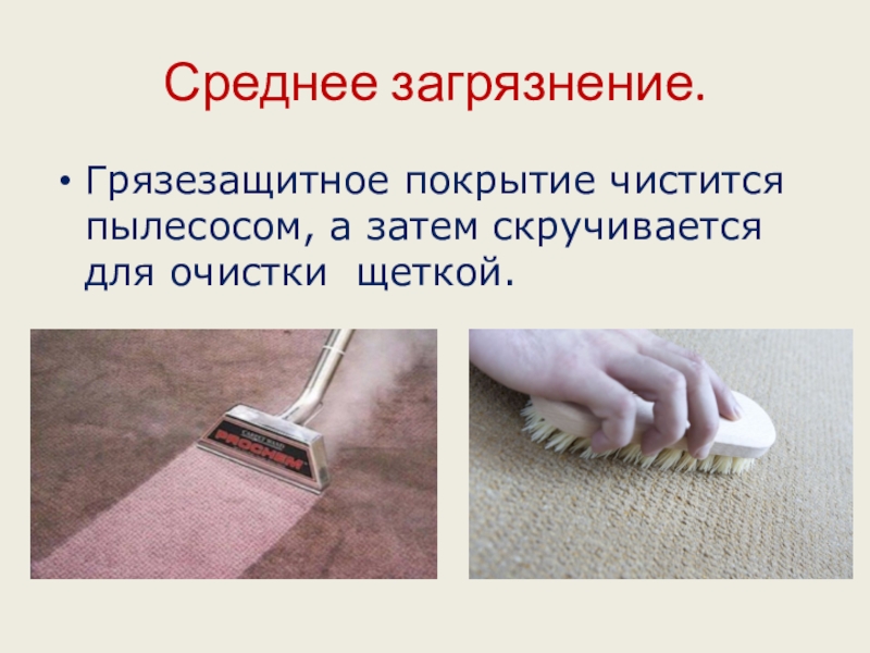 Среднее загрязнение.Грязезащитное покрытие чистится пылесосом, а затем скручивается для очистки щеткой.