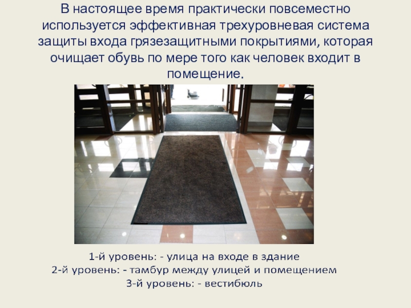 В настоящее время практически повсеместно используется эффективная трехуровневая система защиты входа грязезащитными