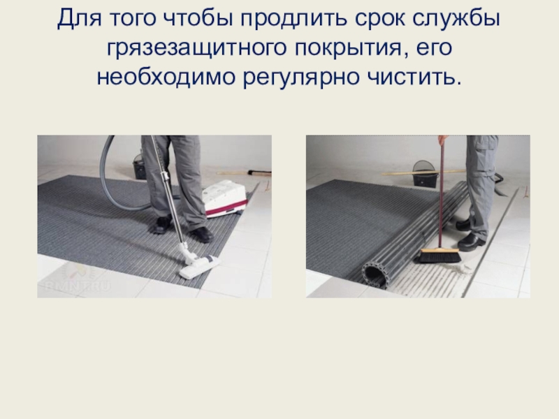 Слайд 12 Для того чтобы продлить срок службы грязезащитного покрытия, его необходимо регулярно