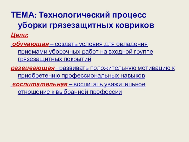 ТЕМА: Технологический процесс уборки грязезащитных ковриковЦели: обучающая – создать условия для овладения приемами уборочных работ на входной