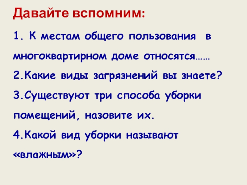 Слайд 3 Давайте вспомним: 1. К местам общего пользования в многоквартирном доме относятся…… 2.Какие виды