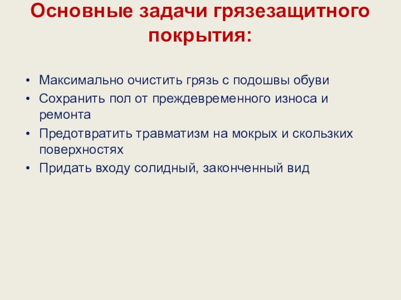 Слайд 10Основные задачи грязезащитного покрытия:
