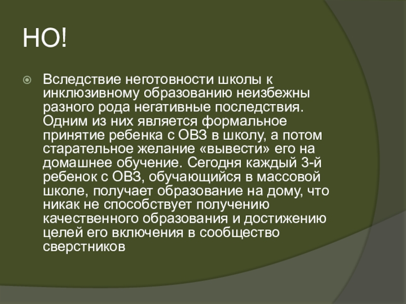 Одним из них является формальное принятие ребенка с ОВЗ в школу, а потом старательное желание «вывести» его на домашнее обучение. Сегодня каждый 3-й ребенок с ОВЗ, обучающийся в массовой школе, получает образование на дому, что никак не способствует получению качественного образования и достижению целей его включения в сообщество сверстников
