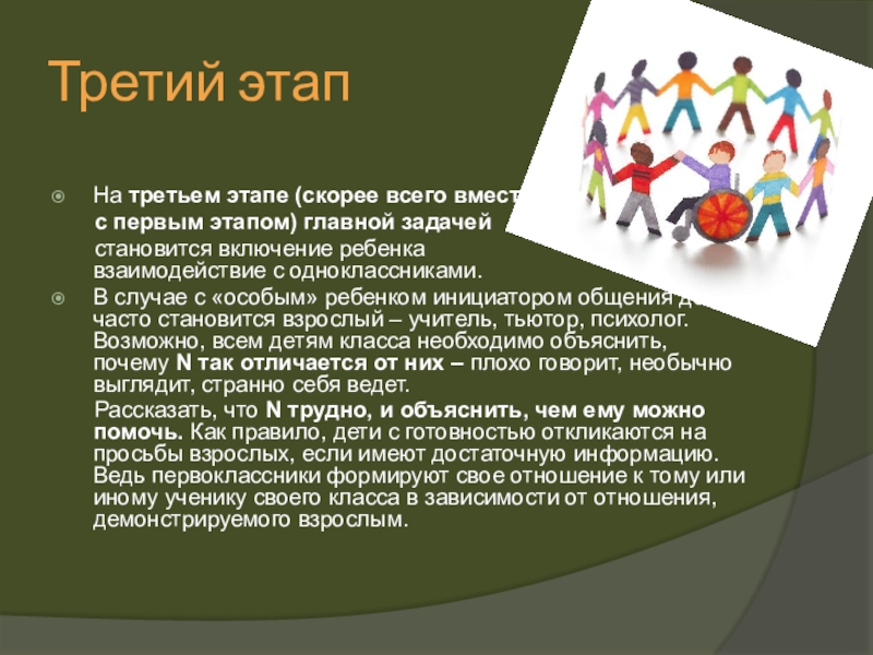 В случае с «особым» ребенком инициатором общения детей часто становится взрослый – учитель, тьютор, психолог. Возможно, всем детям класса необходимо объяснить, почему N так отличается от них – плохо говорит, необычно выглядит, странно себя ведет.