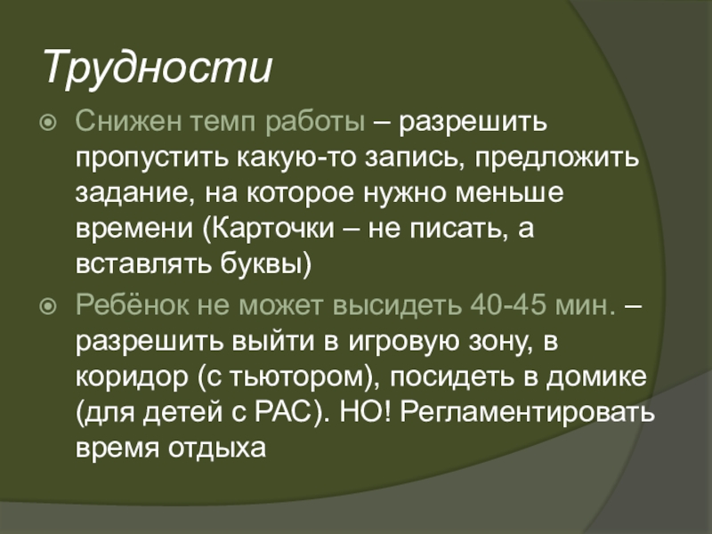 Снижен темп работы – разрешить пропустить какую-то запись, предложить задание, на