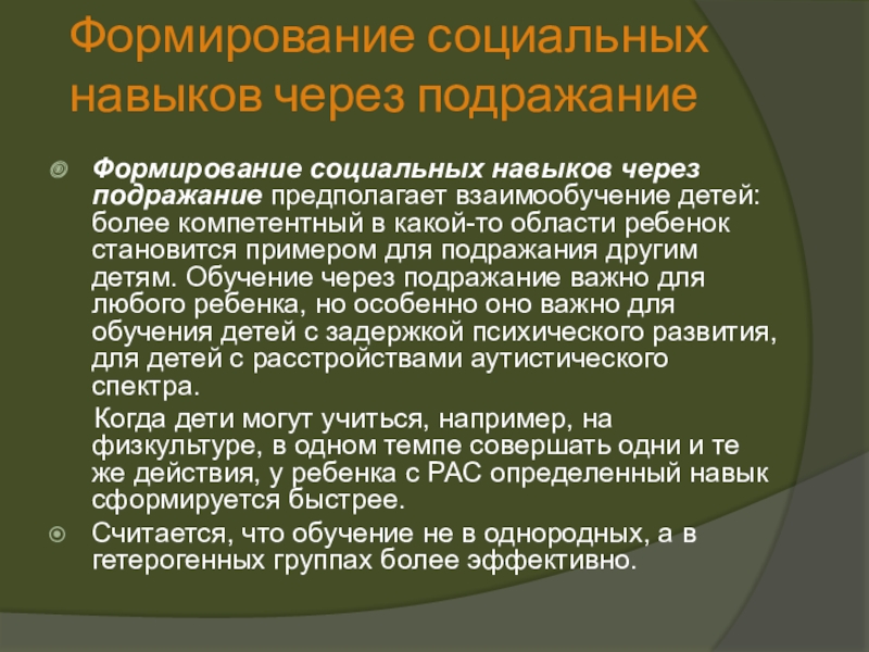 через подражание предполагает взаимообучение детей: более компетентный в какой-то области ребенок становится примером для подражания другим детям. Обучение через подражание важно для любого ребенка, но особенно оно важно для обучения детей с задержкой психического развития, для детей с расстройствами аутистического спектра.