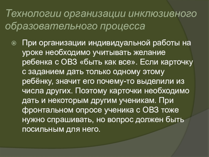 учитывать желание ребенка с ОВЗ «быть как все». Если карточку с заданием дать только одному этому ребёнку, значит его почему-то выделили из числа других. Поэтому карточки необходимо дать и некоторым другим ученикам. При фронтальном опросе ученика с ОВЗ тоже нужно спрашивать, но вопрос должен быть посильным для него.