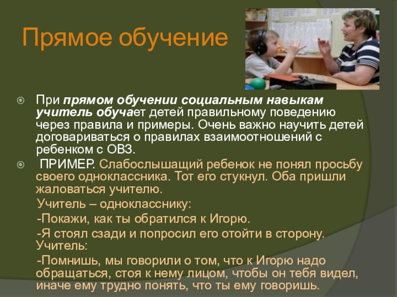 При прямом обучении социальным навыкам учитель обучает детей правильному поведению