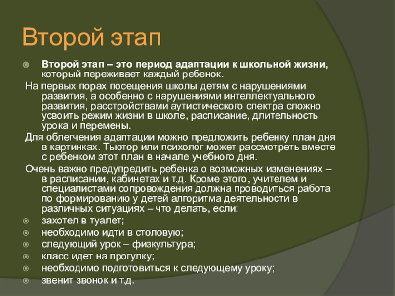На первых порах посещения школы детям с нарушениями развития, а особенно с нарушениями интеллектуального развития, расстройствами аутистического спектра сложно усвоить режим жизни в школе, расписание, длительность урока и перемены.