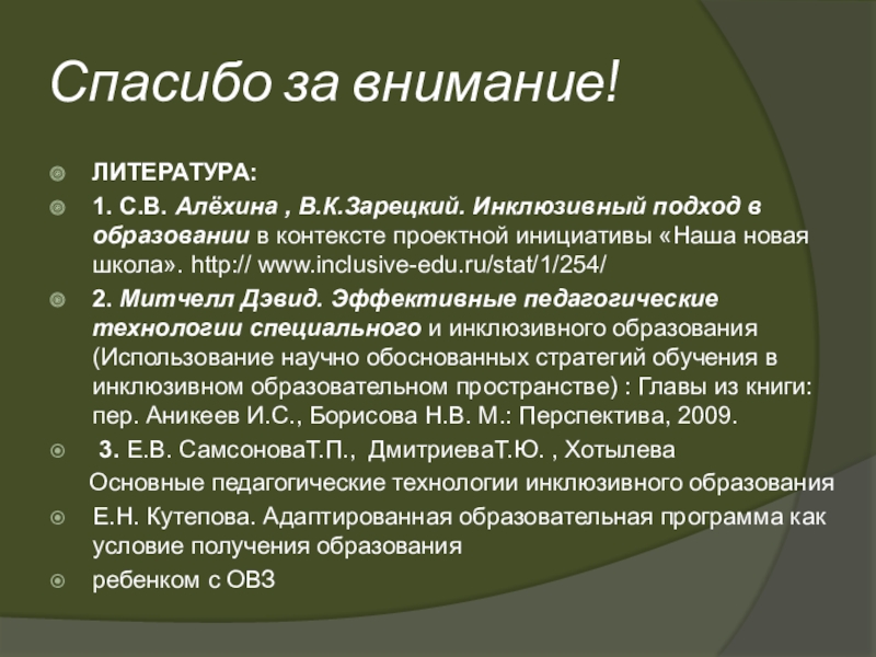 1. С.В. Алёхина , В.К.Зарецкий. Инклюзивный подход в образовании