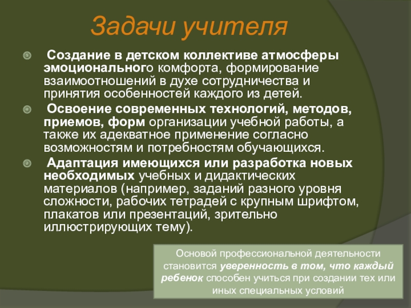 Основой профессиональной деятельности становится уверенность в том, что каждый ребенок способен учиться при создании тех или иных специальных условий