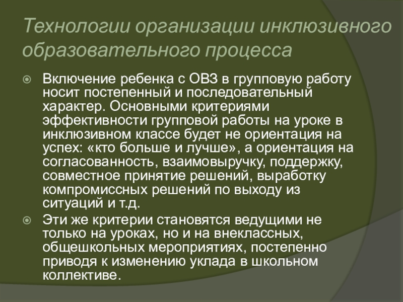 носит постепенный и последовательный характер. Основными критериями эффективности групповой работы на уроке в инклюзивном классе будет не ориентация на успех: «кто больше и лучше», а ориентация на согласованность, взаимовыручку, поддержку, совместное принятие решений, выработку компромиссных решений по выходу из ситуаций и т.д.