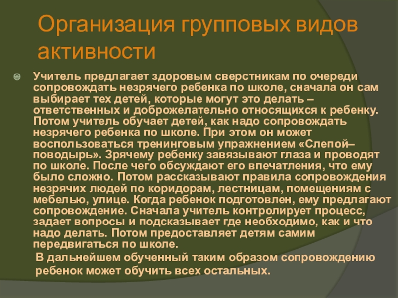 ребенка по школе, сначала он сам выбирает тех детей, которые могут это делать – ответственных и доброжелательно относящихся к ребенку. Потом учитель обучает детей, как надо сопровождать незрячего ребенка по школе. При этом он может воспользоваться тренинговым упражнением «Слепой–поводырь». Зрячему ребенку завязывают глаза и проводят по школе. После чего обсуждают его впечатления, что ему было сложно. Потом рассказывают правила сопровождения незрячих людей по коридорам, лестницам, помещениям с мебелью, улице. Когда ребенок подготовлен, ему предлагают сопровождение. Сначала учитель контролирует процесс, задает вопросы и подсказывает где необходимо, как и что надо делать. Потом предоставляет детям самим передвигаться по школе.