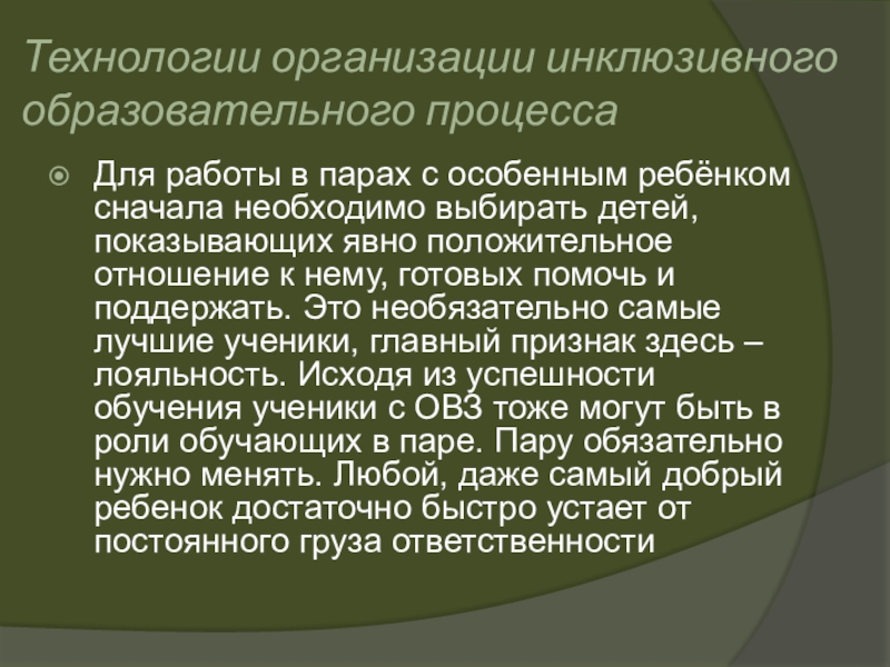 сначала необходимо выбирать детей, показывающих явно положительное отношение к нему, готовых помочь и поддержать. Это необязательно самые лучшие ученики, главный признак здесь –лояльность. Исходя из успешности обучения ученики с ОВЗ тоже могут быть в роли обучающих в паре. Пару обязательно нужно менять. Любой, даже самый добрый ребенок достаточно быстро устает от постоянного груза ответственности