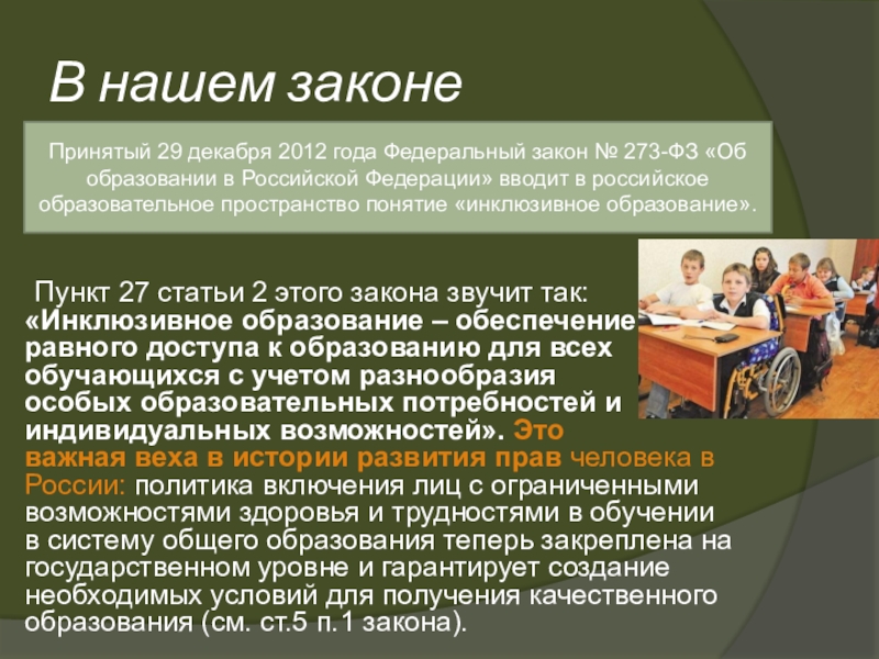 Принятый 29 декабря 2012 года Федеральный закон № 273-ФЗ «Об образовании в Российской Федерации» вводит в российское образовательное пространство понятие «инклюзивное образование».