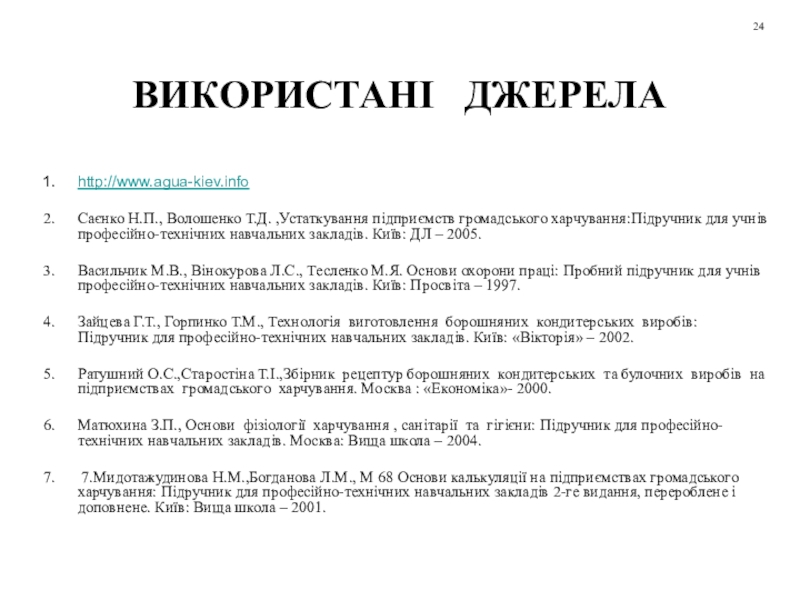 7.Мидотажудинова Н.М.,Богданова Л.М., М 68 Основи калькуляції на підприємствах громадського харчування: Підручник для професійно-технічних навчальних закладів 2-ге видання, перероблене і доповнене. Київ: Вища школа – 2001.