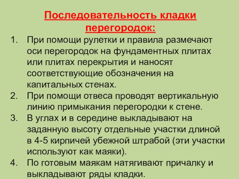 Последовательность кладки перегородок:При помощи рулетки и правила размечают оси перегородок на фундаментных плитах или плитах перекрытия и