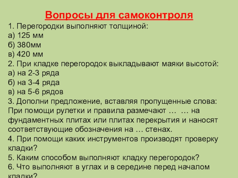 Вопросы для самоконтроля1. Перегородки выполняют толщиной:а) 125 ммб) 380ммв) 420 мм2. При кладке перегородок выкладывают маяки высотой:а)