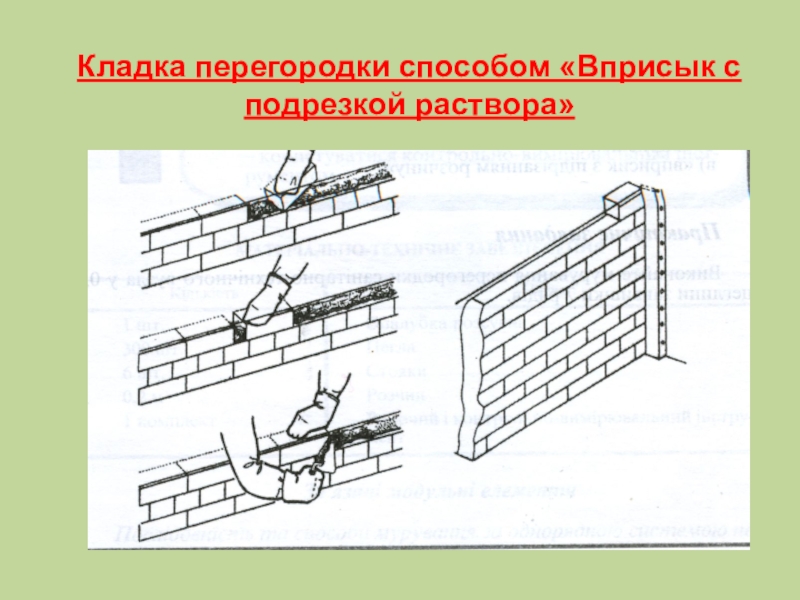 Слайд 3Кладка перегородки способом «Вприсык с подрезкой раствора»
