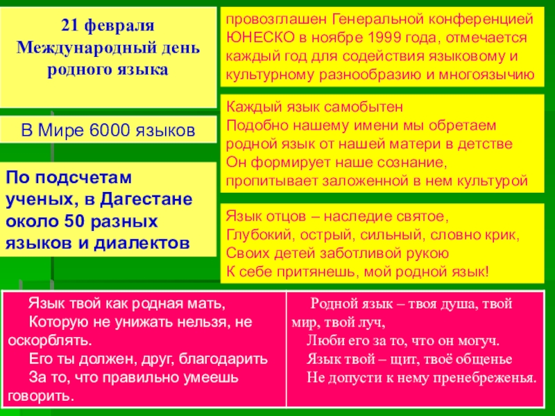 провозглашен Генеральной конференцией ЮНЕСКО в ноябре 1999 года, отмечается каждый год для содействия языковому и культурному разнообразию и многоязычию
