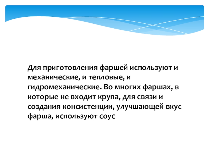 Слайд 8Для приготовления фаршей используют и механические, и тепловые, и гидромеханические. Во