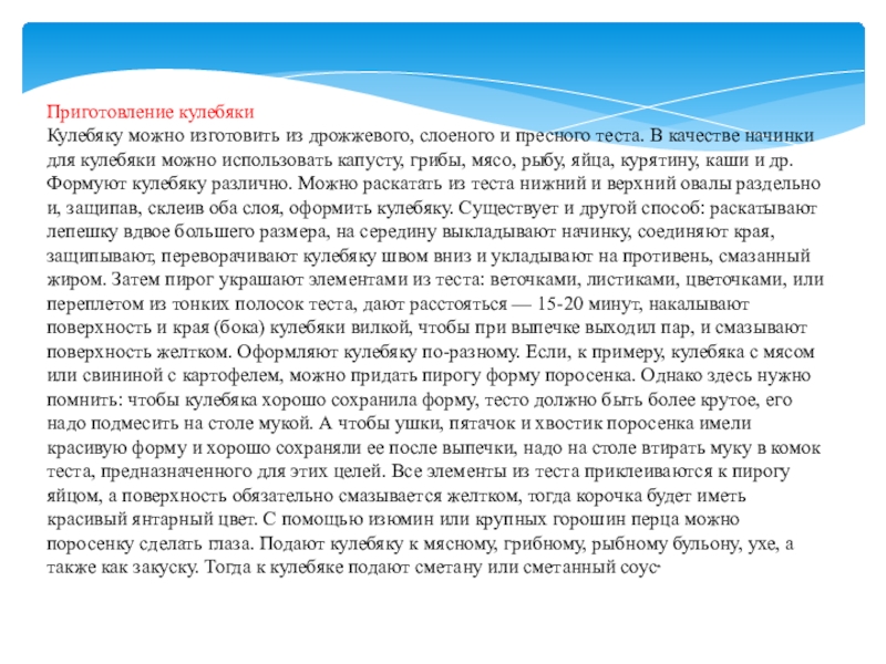 качестве начинки для кулебяки можно использовать капусту, грибы, мясо, рыбу, яйца, курятину, каши и др. Формуют кулебяку различно. Можно раскатать из теста нижний и верхний овалы раздельно и, защипав, склеив оба слоя, оформить кулебяку. Существует и другой способ: раскатывают лепешку вдвое большего размера, на середину выкладывают начинку, соединяют края, защипывают, переворачивают кулебяку швом вниз и укладывают на противень, смазанный жиром. Затем пирог украшают элементами из теста: веточками, листиками, цветочками, или переплетом из тонких полосок теста, дают расстояться — 15-20 минут, накалывают поверхность и края (бока) кулебяки вилкой, чтобы при выпечке выходил пар, и смазывают поверхность желтком. Оформляют кулебяку по-разному. Если, к примеру, кулебяка с мясом или свининой с картофелем, можно придать пирогу форму поросенка. Однако здесь нужно помнить: чтобы кулебяка хорошо сохранила форму, тесто должно быть более крутое, его надо подмесить на столе мукой. А чтобы ушки, пятачок и хвостик поросенка имели красивую форму и хорошо сохраняли ее после выпечки, надо на столе втирать муку в комок теста, предназначенного для этих целей. Все элементы из теста приклеиваются к пирогу яйцом, а поверхность обязательно смазывается желтком, тогда корочка будет иметь красивый янтарный цвет. С помощью изюмин или крупных горошин перца можно поросенку сделать глаза. Подают кулебяку к мясному, грибному, рыбному бульону, ухе, а также как закуску. Тогда к кулебяке подают сметану или сметанный соус.