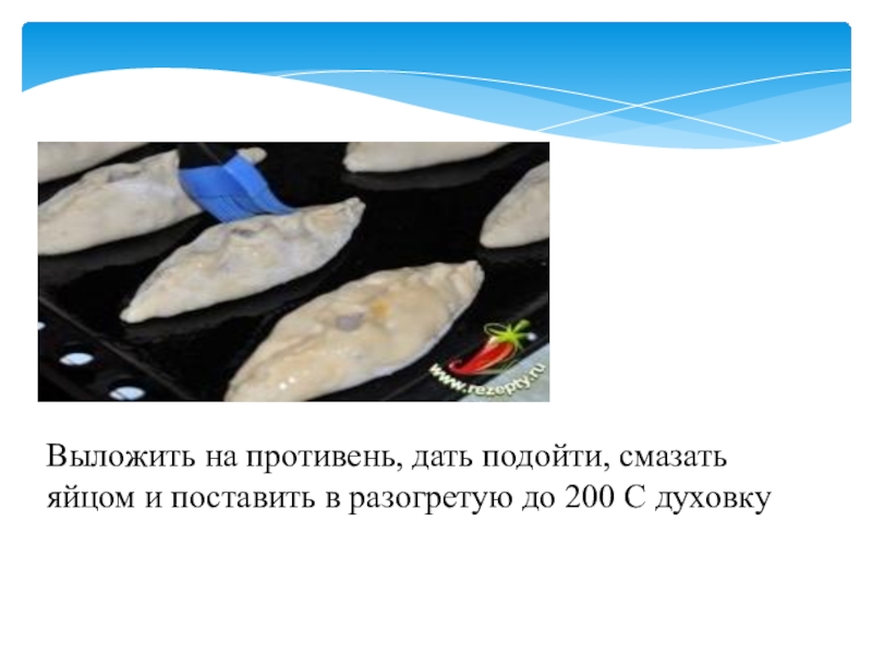 Слайд 20Выложить на противень, дать подойти, смазать яйцом и поставить в разогретую