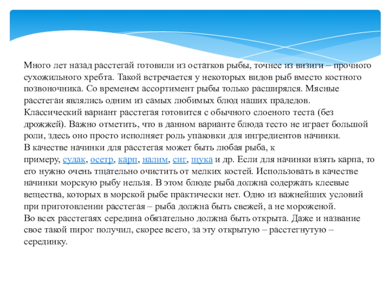 – прочного сухожильного хребта. Такой встречается у некоторых видов рыб вместо костного позвоночника. Со временем ассортимент рыбы только расширялся. Мясные расстегаи являлись одним из самых любимых блюд наших прадедов.