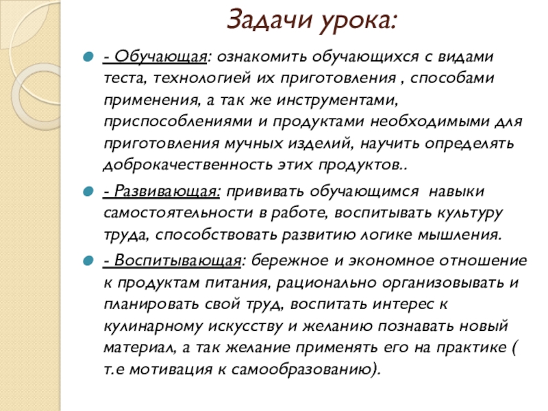 - Обучающая: ознакомить обучающихся с видами теста, технологией их приготовления , способами