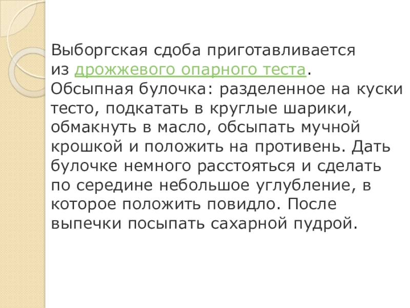 Выборгская сдоба приготавливается из дрожжевого опарного теста.